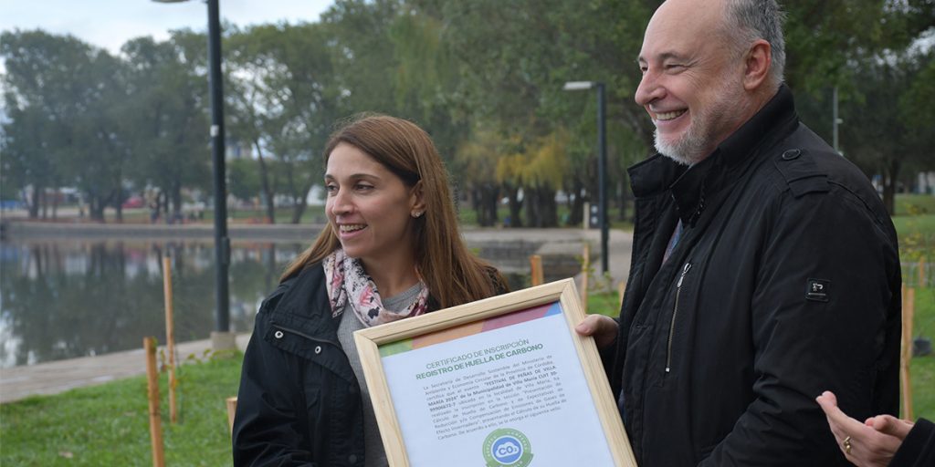 La ministra de Ambiente y Economía Circular, Victoria Flores, entregó al intendente de Villa María, Eduardo Accastello, el Certificado de Inscripción en el Registro de Huella de Carbono, a partir del cálculo de emisiones que realizó en el marco del Festival de Peñas 2024.